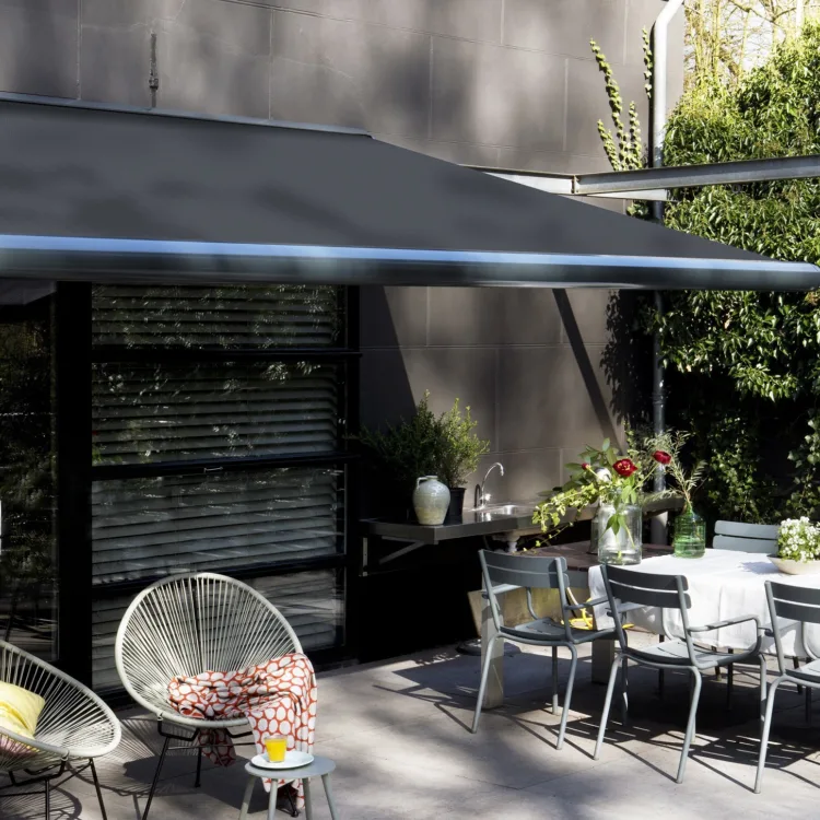 • Knikarmschermen doen hetzelfde en zijn populair als schaduwplekje voor je terras buiten
