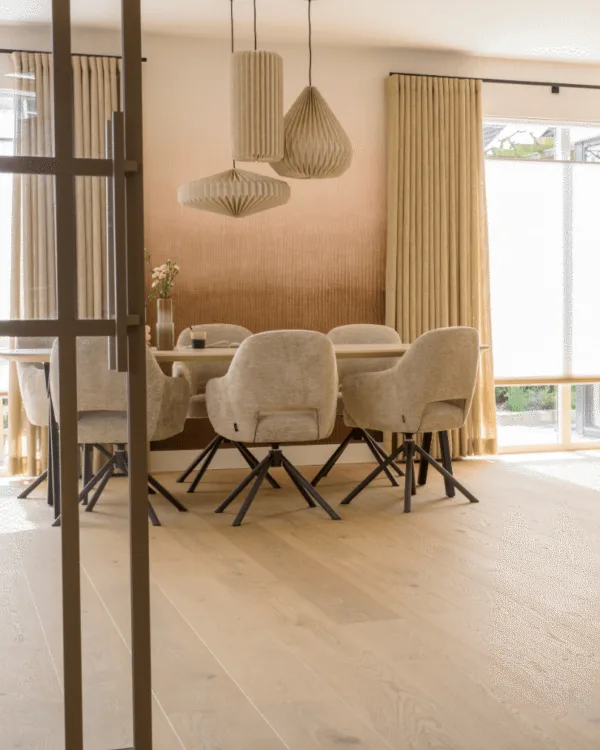 Ik ben fan van fineerparket: het combineert de natuurlijke look van echt hout met de stevigheid die je nodig hebt in een druk huishouden. De matte afwerking en houtstructuur zorgen voor dat warme, huiselijke gevoel. Precies wat je wilt op koudere dagen.