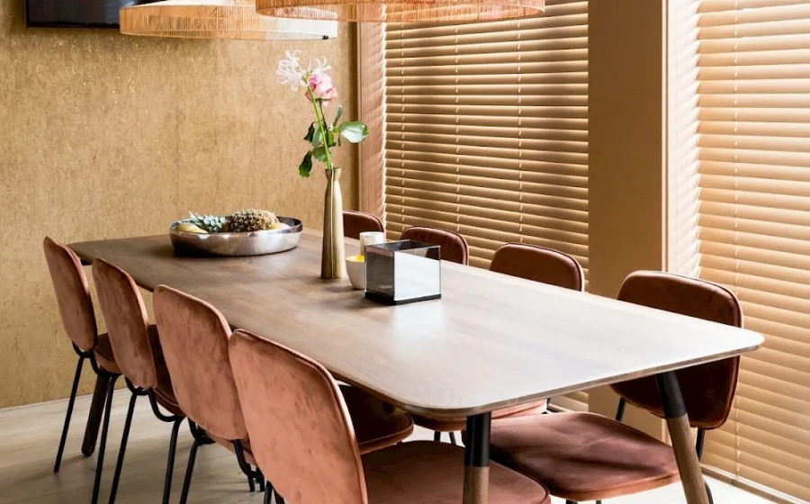 Als je je waant in luxe is glans iets wat daar zeker bij past. Glans in je accessoires in de vorm van gouden of messing lampen en vazen. Satijn glans zie je terug in de stoffen, zoals je gordijnen met bijpassende kussens. Om het rustig te houden kies je voor redelijk effen vloeren. Denk aan een licht houten visgraat vloer zonder te veel noesten, of een strakke in neutrale tint Marmoleum vloer. Voor in de slaapkamer kies je natuurlijk voor hoogpolig tapijt om echt te stappen in het hotelgevoel.