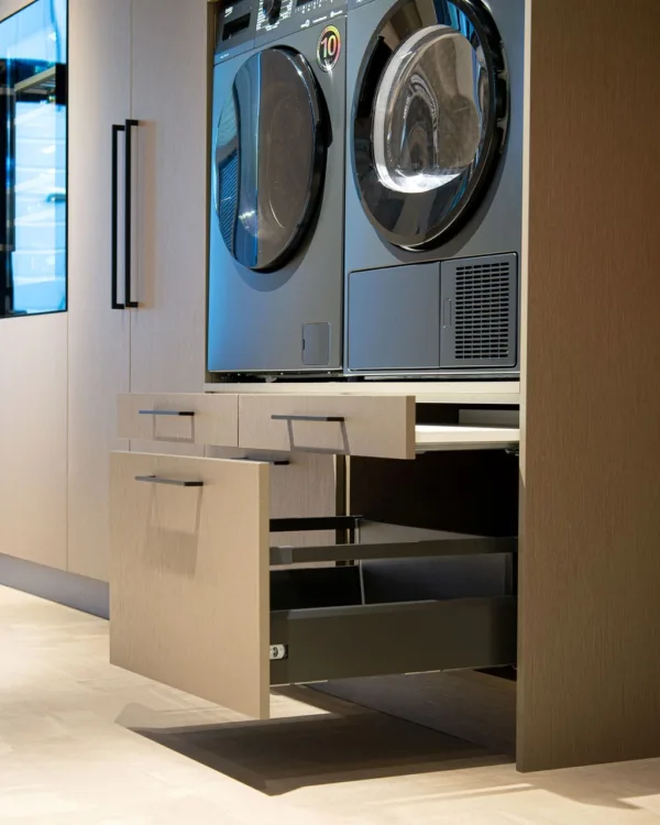 Een wasmachine kast is een verademing voor je rug. Jouw apparaten staan op een prettige hoogte. Je benut elk stukje opbergplek optimaal met zo'n wasmachine en droger kast. Wasmiddel, voorraad of kleding zit achter deuren, dat geeft rust! Combineer je wasmachine kast met een koelkast of wijnkast, een stijlvolle oplossing voor je keuken. Samen ontwerpen wij hem. Ontdek alle opties!