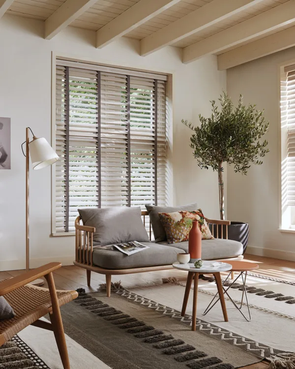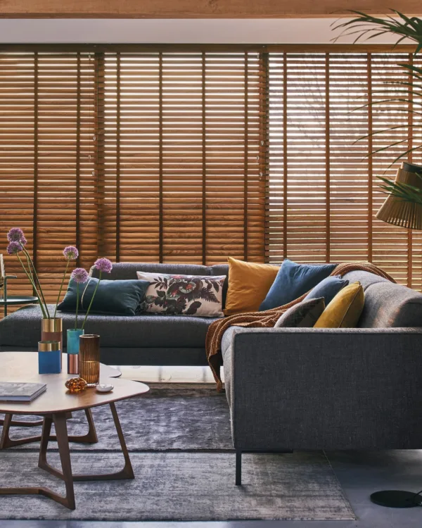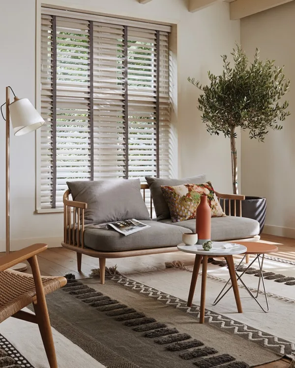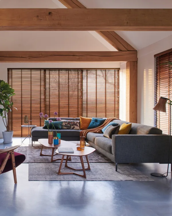 Luxaflex bamboe jaloezieën in Walnut 8305 in de woonkamer voor een warme, natuurlijke sfeer.