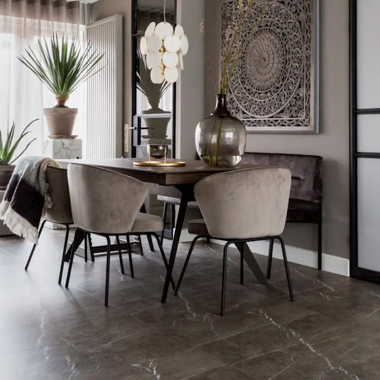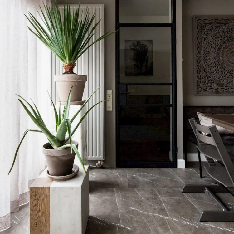 Na de klassieke visgraat pvc vloer van vorige week, hebben we deze week een unieke variant. Stoer en elegant & luxe met een vleugje beton. Het is een pvc vloer van Green-Flor, de Royal Touch (tm 7411-5-XL). Het lijkt gewoon net echt natuursteen, alleen is dit een veel praktischer variant. Het mooiste van de vloer is dat het een combinatie is van beide smaken. Het luxe gevoel waar Sadaf gek op is en het donkere wat weer favoriet is van Saman. Oftewel een stoere en classy combi. Voordeel van deze pvc vloer is dat hij waterbestendig en onderhoudsvrij is. Zo kan hij prima in de keuken liggen én is het een ideale vloer voor kleine kinderen. Gaaf hè zo’n vloer, keer wat anders!
