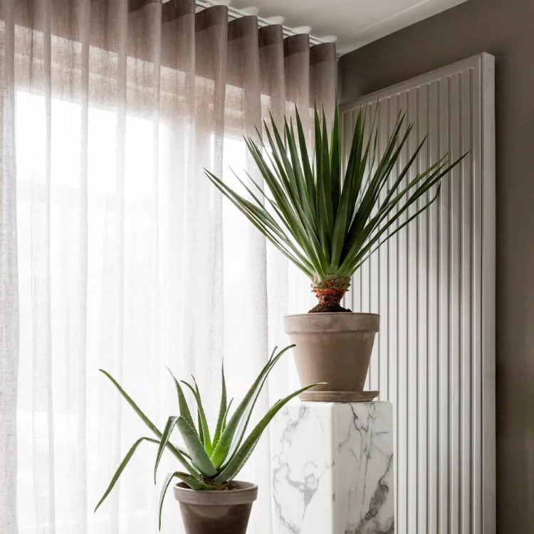 Aan de achterkant van de woning heeft Marianne gekozen voor gordijnen met een transparante linnenlook. Het zijn de voiles van Aanhuis (Lyn 06/1510). De gordijnen zorgen gelijk voor sfeer, zeker door de kleur. Ze zijn opgehangen met een waveplooi, waardoor het mooi valt en het zorgt voor een betere akoestiek en isolatie.