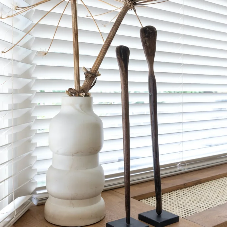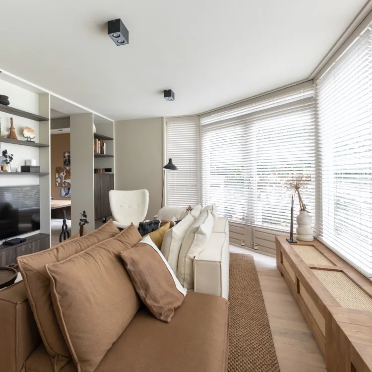 Raamdecoratie of raambekleding is onwijs belangrijk in je woning. Niet alleen kan je de lichtinval zelf bepalen, het geeft ook warmte in de winter en extra koelte in de zomer. Vergeet daarbij ook niet dat je zorgt voor een bak vol privacy. Voor het huis van Karin & Perry heeft Liza gekozen voor de houten jaloezieën van Luxaflex® in dezelfde kleur als de muur en het plafond. Zo maak je van de grote raampartij een rustig geheel. Maar er is meer….