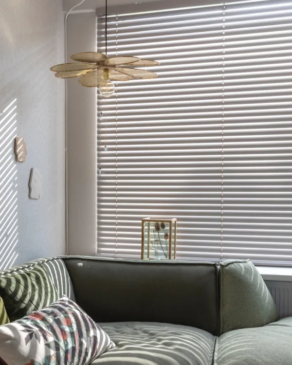 De Luxaflex® jaloezieën in de lichte kleur laten het licht heerlijk binnen. Het geeft je de privacy die je nodig hebt, maar ook voldoende licht. Televisiekijken gaat met gemak als je ze dichtdoet en stiekem naar buiten kijken kan als je ze heel iets openzet. Hetzelfde geldt voor in de keuken, want daar hangen ze ook. Een geheel plaatje als het gaat om raamdecoratie. De iets bredere lamellen maken de jaloezieën stoer en op die manier passend bij zowel de stijl van Valentin met de zachtheid van kleur voor de stijl van Marlijn.