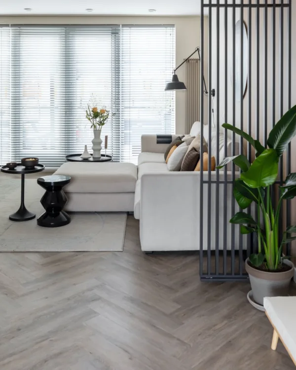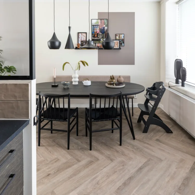 De basis, de vloer dus, die móest anders. Het gaf gelijk een donkere sfeer in huis (en dat willen we niet). Eva heeft gekozen voor de Malgas pvc vloer van onze Aanhuis collectie. Deze heeft ze laten leggen in de moderne visgraat. Passend bij de Scandinavische voorkeur van Deborah, waarin ze ook snakt naar natuurlijke materialen. De kleur 4470 heeft een echte houtlook, met de voordelen van pvc. Onderhoudsvrij, gemakkelijk schoon te houden en ijzersterk. Een basis waar wij en zeker Deborah & David helemaal weg van zijn.