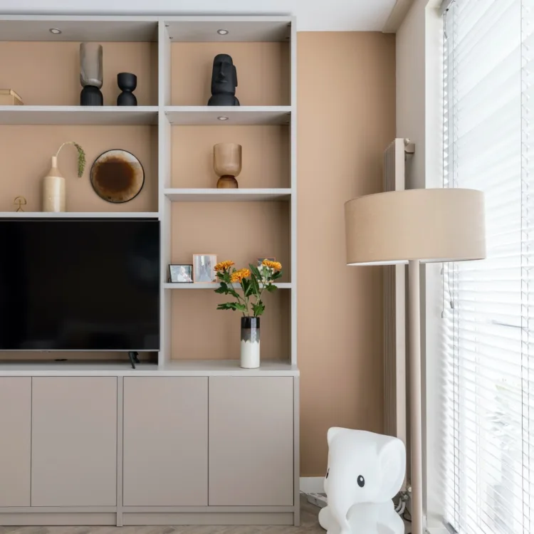 Last but not least: de onwijze TV- kast op maat van Allure. Het huis had een gebrek aan opbergruimte. Nou, nu niet meer. Onze kast vrienden van Allure hebben namelijk een mooie opbergkast geplaatst met voldoende ‘show’ ruimte. De kast is uitgevoerd in de kleuren Steengrijs en Cloud Grey en voorzien van ingefreesde ledspots die te bedienen zijn met een afstandbediening. De deurtjes zijn push to open, dus je hebt geen handvat aan de kast én je kan ze zachtjes dichtdoen door de softclose die erop zit.