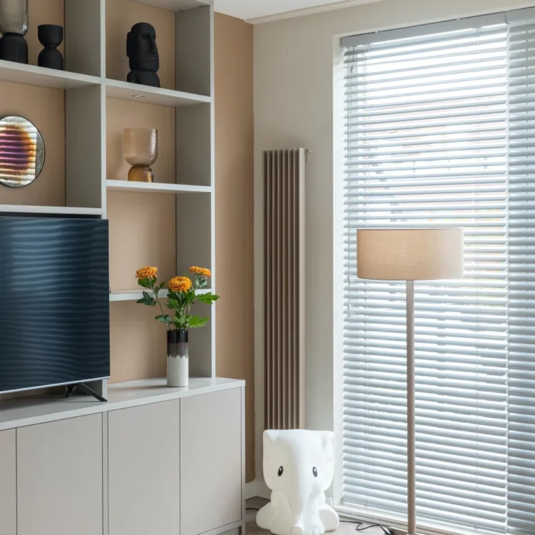 Met een nieuwe nieuwbouwwijk tegenover je huis wil je wel wat privacy. Weg met die inkijk en dat is gelukt met onze aluminium jaloezieën (50 mm - kleur 1726) voor de ramen. Daarbij haalt het ook veel van de lichtinval weg. Het mooiste aan jaloezieën is dat je de ‘lamellen’ kunt kantelen, zodat jij zelf kan bepalen hoeveel licht je naar binnen wilt laten schijnen. Want licht is fijn, alleen teveel soms best irritant. Ook kan je ze zo kantelen dat je wel lekker naar buiten kunt kijken, maar de overkant niet bij jou naar binnen. Win-win-win-win situatie dus ;-)