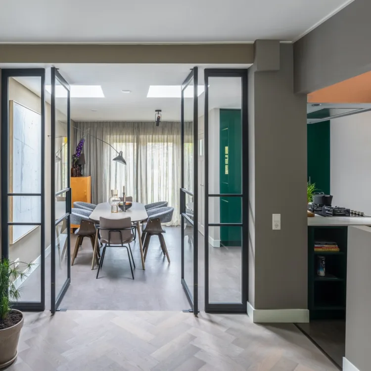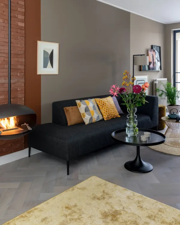 Soms zie je een aflevering van vtwonen en dan wil je gewoon alles. Alsof ineens de kleuren, de materialen, de persoonlijke spulletjes bij elkaar komen en je omverblazen. Nu had ik het bij deze, mijn collega’s weer bij anderen. De sfeer die Fietje in het huis van Ilse & Cas heeft gebracht gaat verder dan het samenbrengen van twee smaken. Het is een hele nieuwe stijl. Met de voorkeur van Ilse voor donkere tinten en vintage spullen en de smaak van Cas, het lichte en toch met een Scandinavisch tintje. Gooi daar nog wat persoonlijke spullen bij en je hebt een huis. Eindelijk een fijne indeling voor de lange smalle kamer. Zeker met de onderbreking van de stalen deuren. En toch fijn dat wij van Aanhuis.nl de ‘basis’ hebben gelegd voor dit huis. Letterlijk dan ook; want wij zijn er deze week geweest voor de complete vloer!