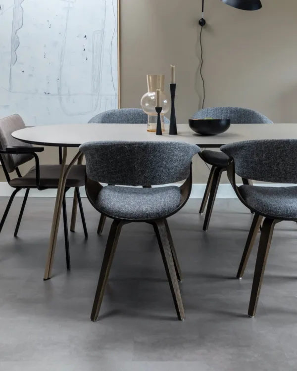 Ook in de keuken mochten wij onze magic showen. Meest ideale vloer voor in de keuken is wel een pvc vloer. Een pvc vloer kan tegen een stootje, tegen een hele plens met water én je hebt hem zo schoon. Fietje heeft gekozen voor een tegenhanger van de parketvloer in de woonkamer, namelijk een grijze pvc tegel van 60x60 van onze eigen Aanhuis collectie (Antwerpen). De grijze kleur is een perfecte basis voor de gekleurde keuken en, zoals ik net al zei, past ie perfect bij de vloer in de woonkamer. Als je kijkt naar de smaken van Ilse & Cas dan is ie voor beide perfect. Strak en donker. Win en win. Mooi en mooi, toch?