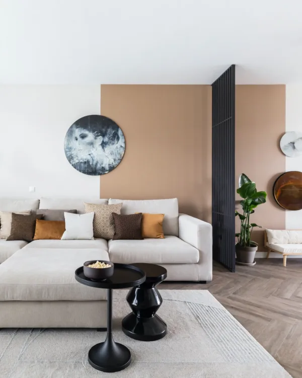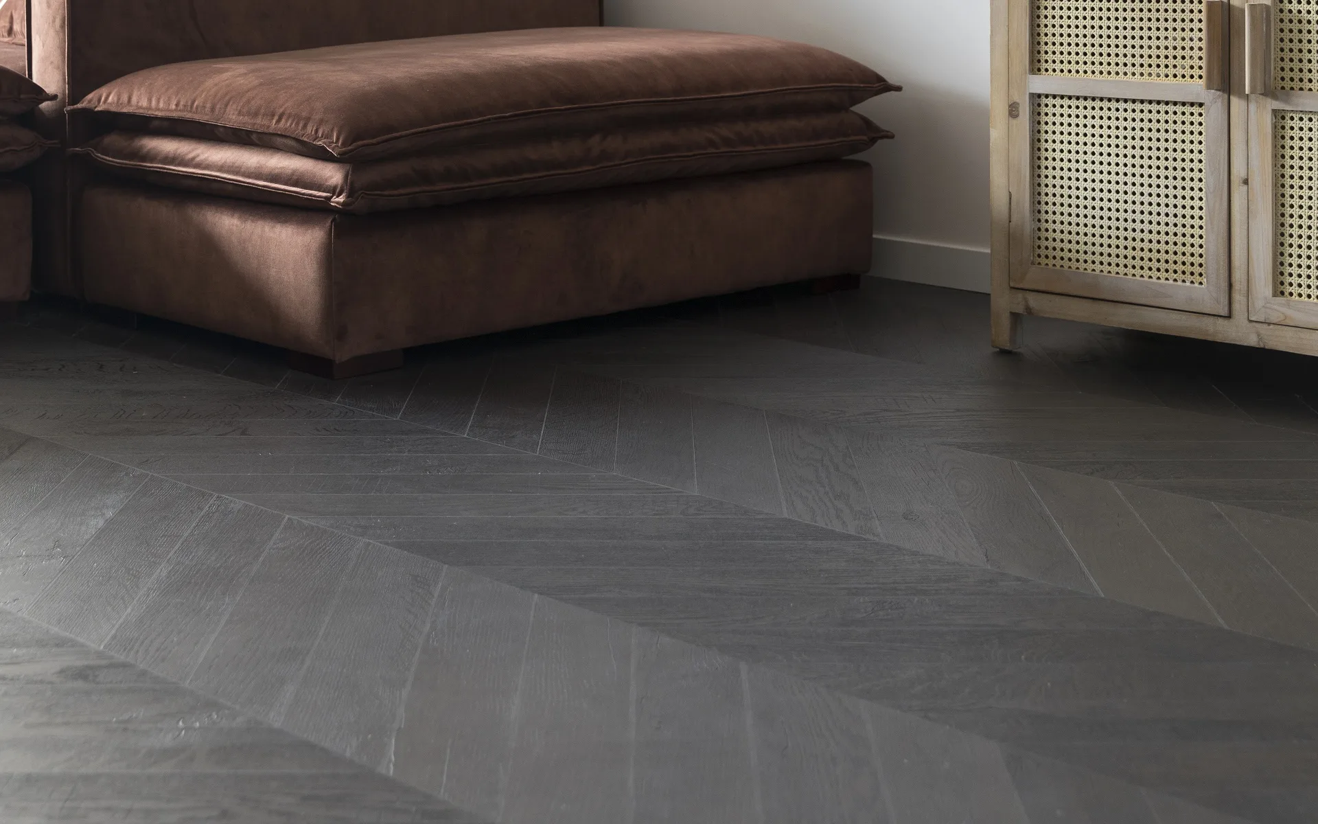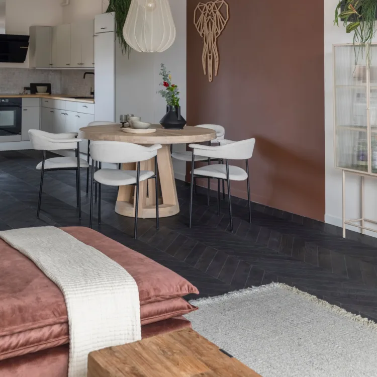 De grote woonkamer krijgen ze maar niet gezellig. Ook de grote blauwe wand heeft niet geholpen. Maar daar heeft Eva wel iets op gevonden, ze heeft voor een statement vloer gekozen. De huidige vloer lag er al en eigenlijk vonden ze hem al meteen niet mooi. Hij is nu zo flink verkleurd, dat ie wel aan vervanging toe is. Eva heeft gekozen voor een donkerbruine, bijna zwarte, pvc vloer van Moduleo Moods (103). De vloer heeft door de kleur al een ‘wow’-effect, maar door het leggen in een Hongaarse punt nóg meer klasse gekregen. Net weer even iets anders dan een visgraatvloer die we de laatste tijd wel vaker zien. Lindie houdt ook wel van net even iets anders, dus dit past perfect.