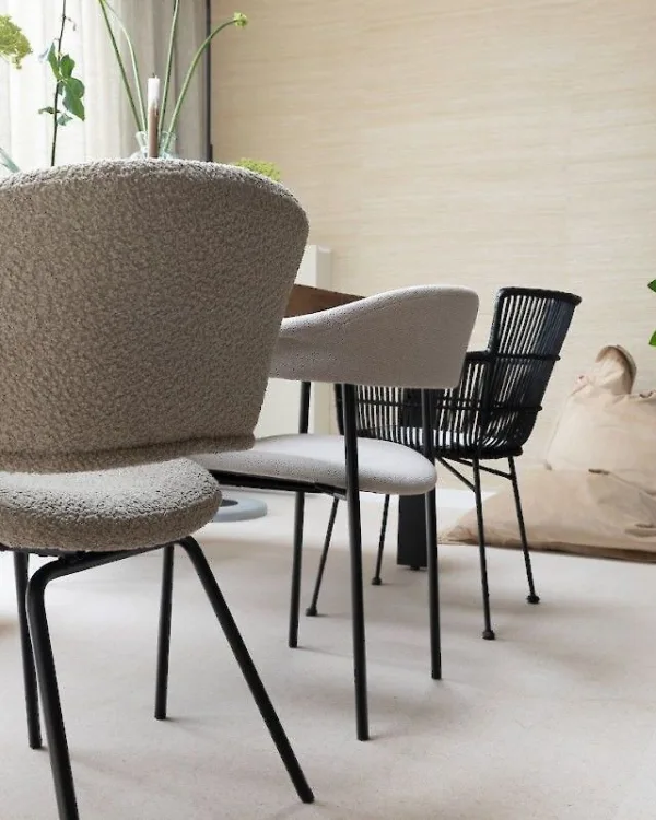 In het serre gedeelte ligt een lichte duurzame vloer (CorQ natuur 202402) van kurk met ook het echte kurkmotief, afgewerkt met een lichtgrijze slijtlaag. Door in het gedeelte waar de eettafel staat een andere vloer te leggen heeft Eva een tweedeling gemaakt in de kamer. Twee verschillende werelden of eilanden die zeker bij elkaar passen.