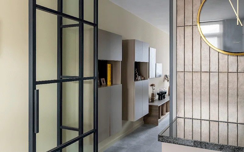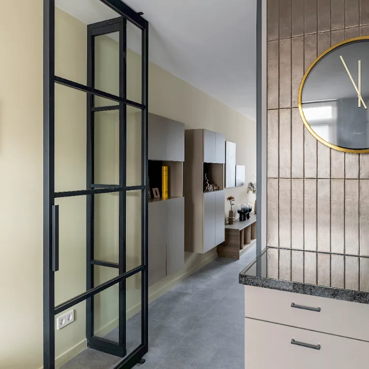De vloer is al een echte verbinder van de keuken met de woonkamer, want het blijft een smal gangetje. Wat kun je daar nou mee? Nou...daar weet Fietje wel raad mee! Want juist deze doorgang leent zich prima voor een kast op maat. Wat die heb je in vele soorten en maten. Dit is wel een een hele slimme oplossing!