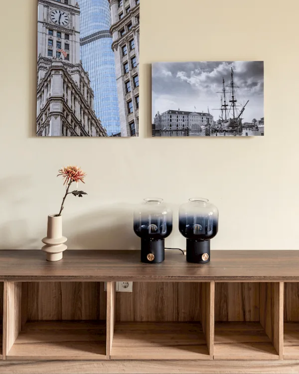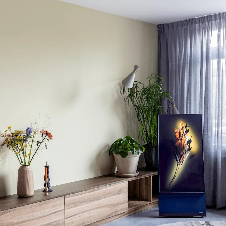 Er is ook een lange lage kast geplaatst van 760cm, in de kleur Sablé LR 77 en met het toppaneel weer in de kleur Sablé LR 81, gelijk aan de achterwand van de hangkasten. De lage kast heeft open vakken en helemaal rechts is de kast voorzien van klepdeuren. Op deze kast voldoende plek voor leuke tierelantijntjes en mooie bloemen. En je kan op deze kast zitten! Lekker met een boek of tijdens een gezellige borrel waardoor je dus altijd voldoende zitplaatsen in je woonkamer hebt. Dat is nog eens een top-oplossing!