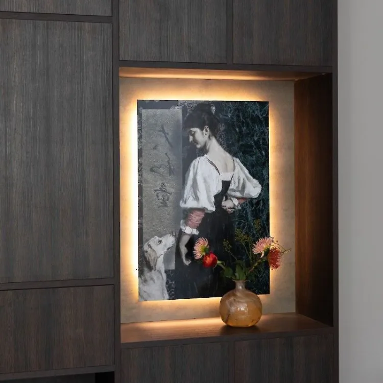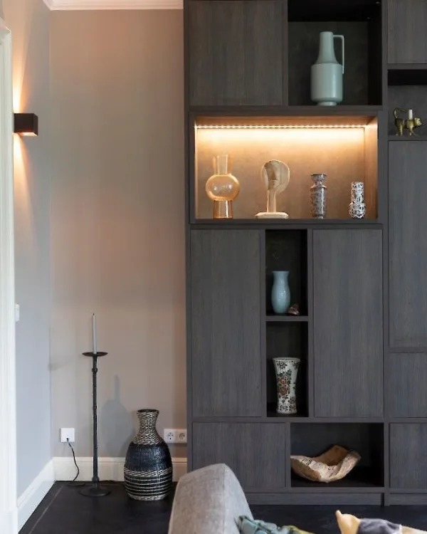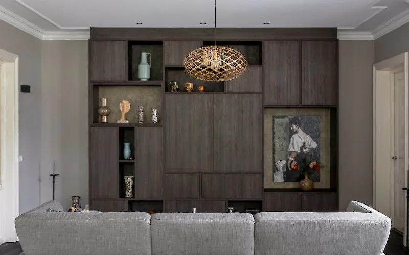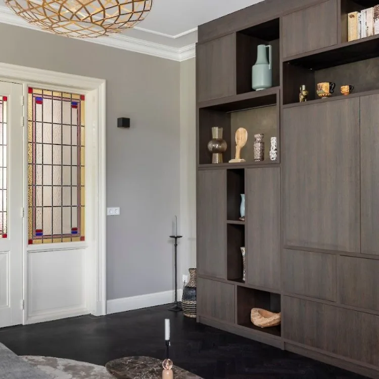 En heb je die kast op maat gezien?! Wat een mooie manier om de televisie in weg te werken. En het geeft bergen opbergruimte en de mogelijkheid om alle leuke spullen van Mike en Marleen te showen. De kast is gemaakt van 28mm plaatmateriaal. De inliggende deuren zijn 18mm en hebben een push-to-open functie. Wat de kast echt uniek maakt is dat er rechts in de kast een schilderij verwerkt waar ledstrips achter geplaatst zijn. De verlichting is dimbaar en werkt met een afstandsbediening. En ohja, de televisie staat achter de gesloten deuren :). Al met al absoluut geen standaard kast!