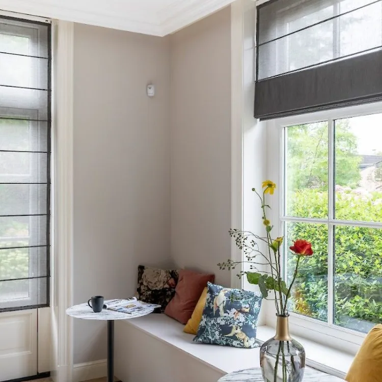Wow die velours gordijnen! Ze zijn van Luxaflex®, stof Vayen kleur 7168. Praktisch, want donker. En mooi, want ze passen bij de stijl in het nieuwe oude huis. En ook stoer, want elektrisch! Net als de vouwgordijnen in de keuken overigens. Deze zijn ook van Luxaflex®, kleur 7234. Alles is slim geprogrammeerd. Voor de (vouw)gordijnen maken we gebruik van Luxaflex® PowerView® automation. Zo doen de (vouw)gordijnen de hele dag precies wat jij wilt. Je bedient ze met je telefoon, stem of een afstandsbediening.