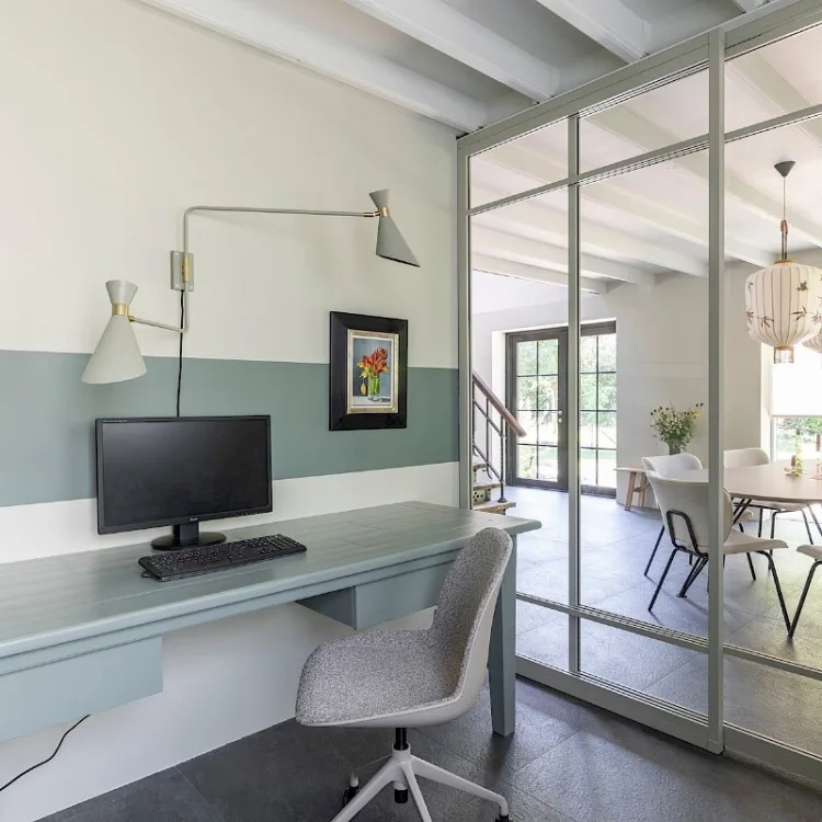 Stalen deuren zijn er in veel verschillende soorten. Denk aan enkele en dubbele deuren, maar ook aan taats- of schuifdeuren. Je kan zelf een vlakverdeling van het glas kiezen. Dat glas kan transparant zijn of van melkglas, daarmee verminder je inkijk. Het grote voordeel is dat je nu echt een aparte werkruimte hebt zonder dat het woongedeelte kleiner lijkt. Door al het glas blijft het lekker licht in zowel het woon- als werkgedeelte. Hij blij, zij blij!
