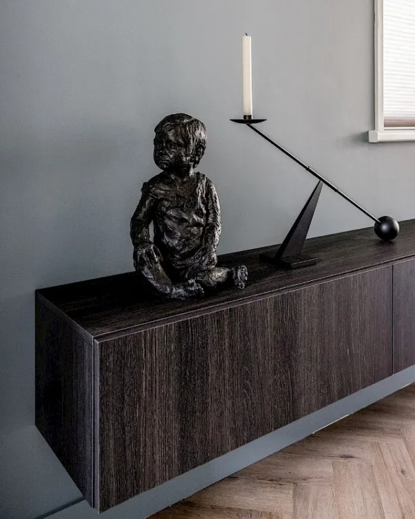 Bij de eethoek is een lang, smal wandmeubel gemaakt. Weet je dat er bij Aanhuis.nl ook hele mooie kasten zijn, bijvoorbeeld GAAF! van Allure? Deze worden ook zwevend gehangen en daarmee kan je echt geweldige combinaties maken. Kortom, kom naar de winkel. We adviseren en helpen je graag om de kast van jouw dromen te realiseren!