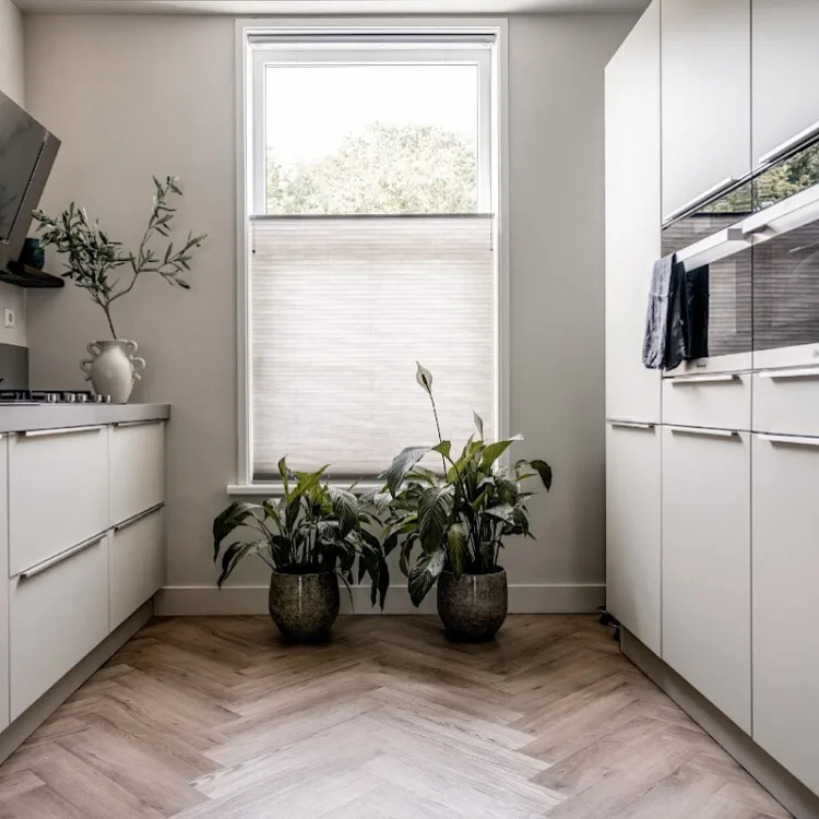 Een pvc vloer is een hele veilige basis en gemakkelijk in gebruik. Krasbestendig, bestand tegen water, eenvoudig schoon te maken en de keuze in kleuren en dessins is groot. Je kan kiezen voor onder meer een betonlook of een houtlook vloer. Kies je dat laatste dan kan je ook nog een brede visgraat laten leggen. Heel mooi wanneer je ervoor kiest om dat over de hele benedenverdieping door te laten lopen, zoals hier in IJmuiden.