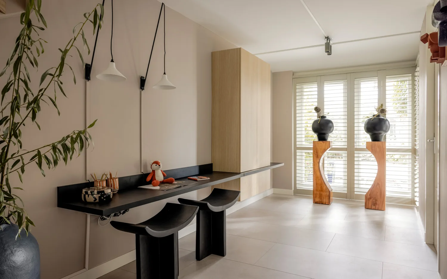 Er mocht ook wel meer opbergruimte komen en een leuk plekje voor dochtertje Georgie. Liza heeft daarom gekozen voor een strakke garderobe/opbergkast op maat van Allure bij de keuken, dat bovendien voorzien is van een werkblad. Door een draaideurkast op maat op unieke wijze te combineren met een breed werkblad, hebben Dainara en Charly niet alleen meer opbergruimte dat niet in het zicht zit, maar is er voor hun dochtertje ook een heerlijke plek ontstaan om straks lekker te kleuren en knutselen.