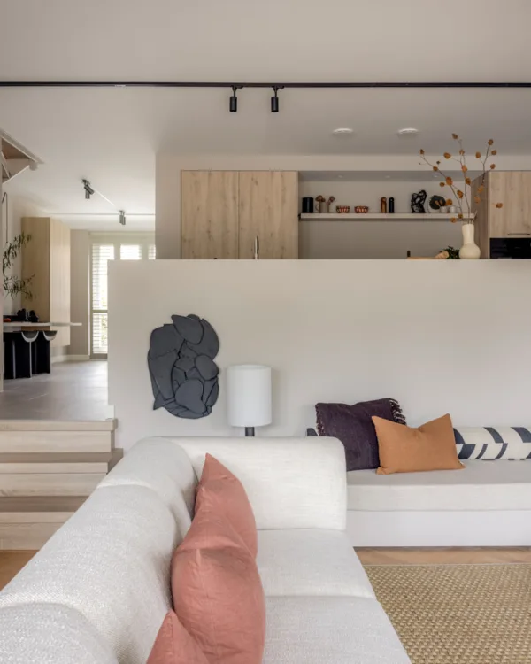 Op het hoger gelegen woongedeelte lag een donkere glanzende tegelvloer gaf een kil effect aan de woning, hoog tijd om te vervangen dus! De vloer in het woongedeelte blijft liggen, Liza is dus op zoek gegaan naar een vloer die goed bij de bestaande houttint past. Daarom heeft ze gekozen voor een pvc-vloer van Coretec®, namelijk de Albaron. Deze pvc-tegels zijn van een groot formaat, wat voor rust zorgt, en de neutrale tint vormt een goede basis voor het interieur.