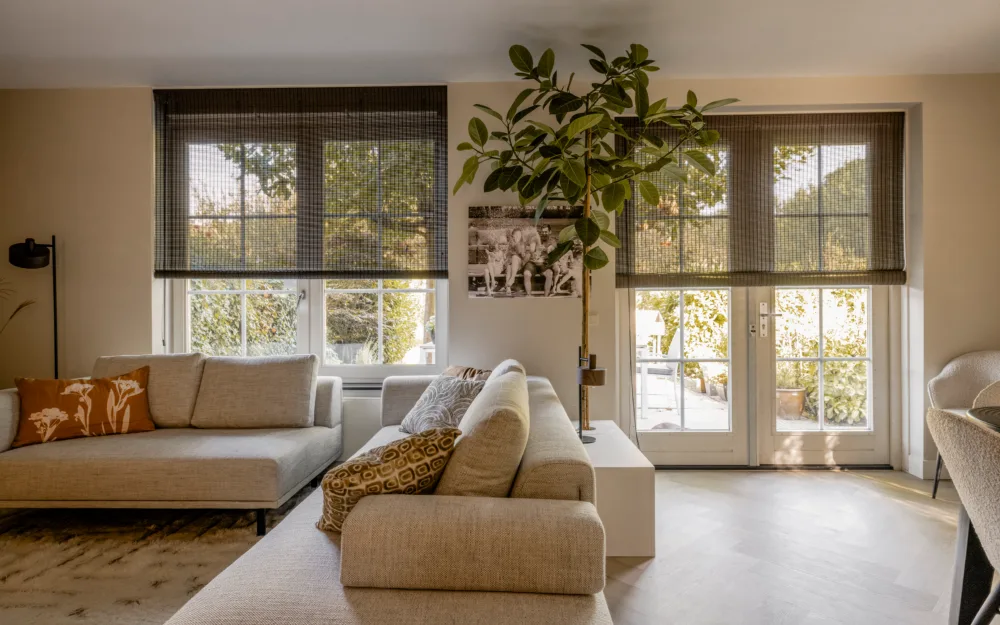 Daar waar Wendy van natuurlijke materialen houdt en Jaap een voorliefde voor donkere kleuren heeft, is dit DE oplossing voor hun ramen. Want in alle vertrekken, woonkamer, eetkamer én keuken hangen wij dezelfde geweven hout rolgordijnen in de kleur 7338. Een super trendy en hippe vorm van raamdecoratie. Ingemeten en gemonteerd door de vakmensen van Aanhuis.nl.