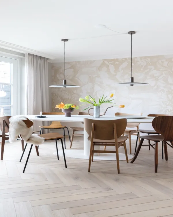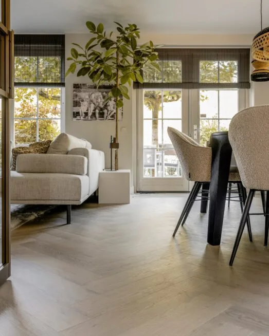 Om eenheid te houden en het zit- en eetgedeelte met elkaar te verbinden, leggen wij een hele toffe visgraat pvc-vloer. Dit is de beige eiken houtlook, genaamd Sicilië uit de Aanhuis-collectie.