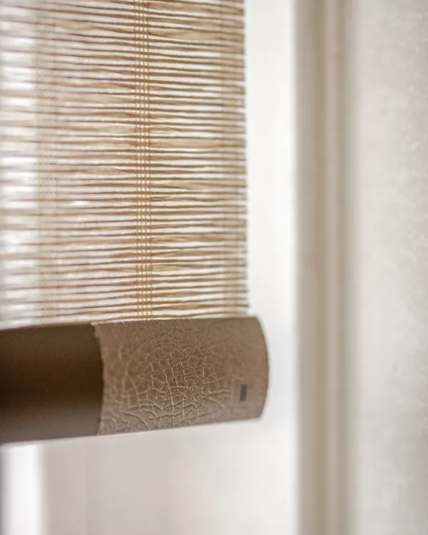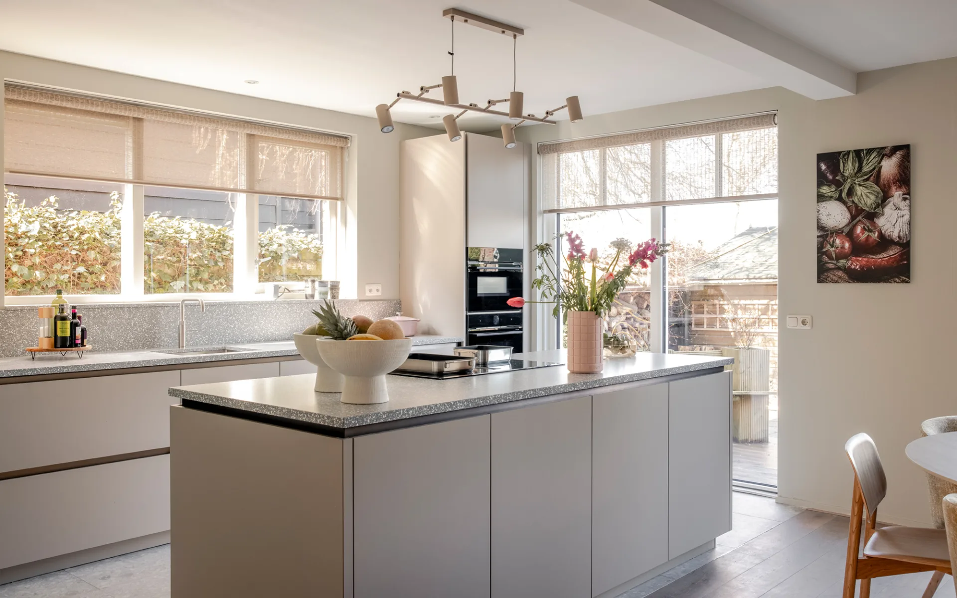 Aan de achterkant mocht het juist wel wat speelser en natuurlijker met het uitzicht op de mooie grote tuin. Daarom is Fietje hier gegaan voor de geweven hout rolgordijnen van Inside, in de kleur Gobi nr. 30. Doordat het geweven hout namelijk grof geweven is, houd je het uitzicht op de tuin als de gordijnen dicht zijn. Zo verlies je niet het contact met buiten en wordt bovendien de rust bewaard, helemaal volgens de wensen van Jeroen dus.