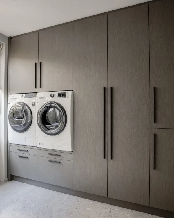 Compleet op maat gemaakt, dus die wasmachine, droger én koelkast passen er perfect in en er blijft ook nog eens meer dan genoeg opbergruimte over voor alle (sport)spullen. Bovendien is de kast extra verstevigd, zodat de wasmachine en droger ongestoord hun werk kunnen doen. Door te kiezen voor een stoere mosgroene kleur, namelijk FB66 Reflex, maakt Fietje een echte statement in de lichte bijkeuken.