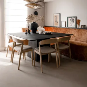 Laten we beginnen met de tegelvloer in de keuken en eethoek. Niet alleen omdat het een stuk mooier kan, maar ook een stuk warmer aan de voeten! Liza koos voor een prachtige Corestone nature gietvloer in de kleur Jute. Deze vloer heeft een natuurlijke, matte structuur en is niet alleen super modern, maar ook volledig waterproof! Perfect voor ruimtes waar af en toe gemorst kan worden. De perfecte balans tussen stijl en functionaliteit.
