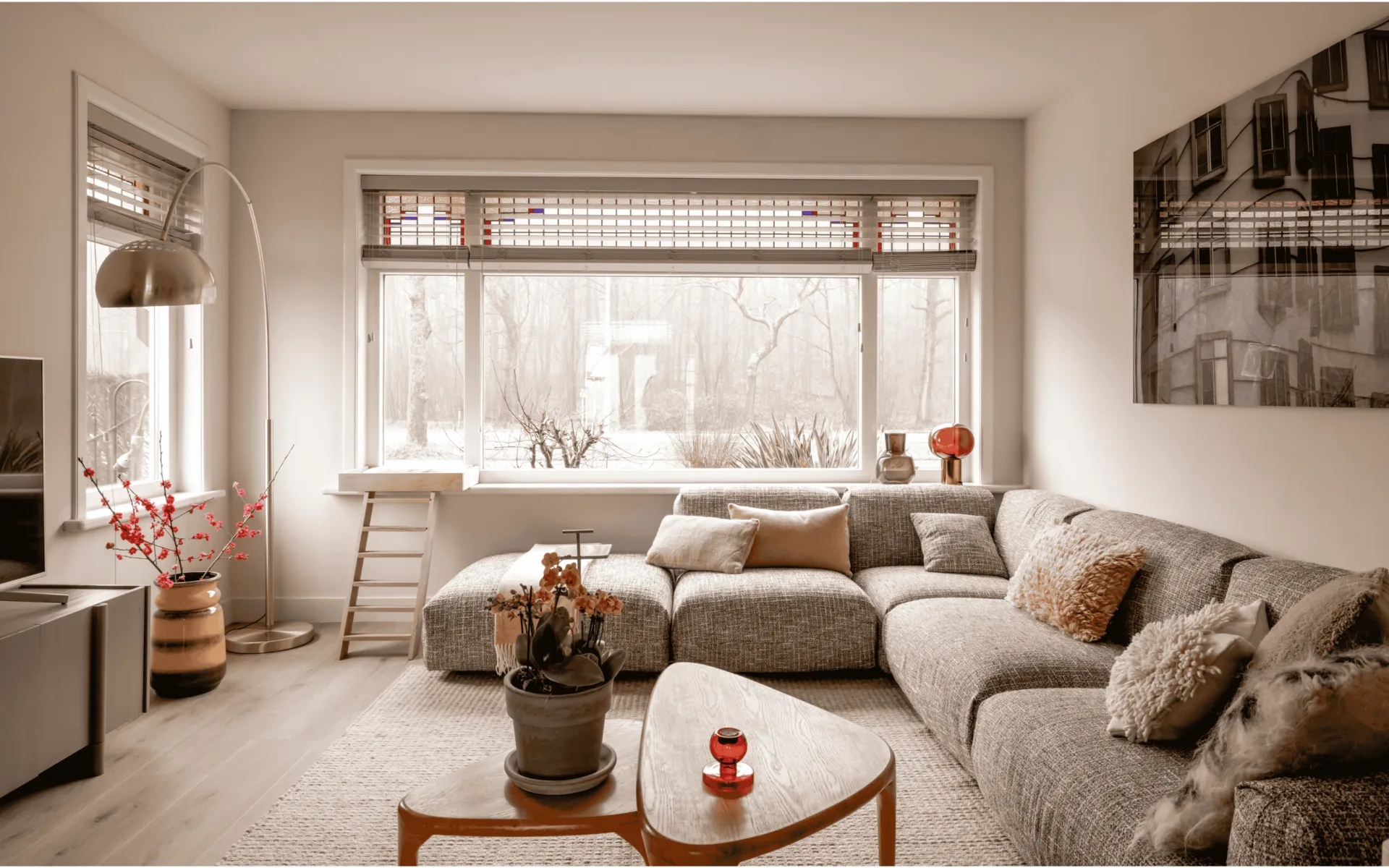 Sfeerfoto van een basic naturel woonkamer met witte horizontale jaloezieën